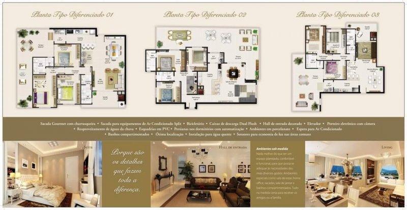 Conta com espera para split, caixas de descarga dual flush, elevador, porteiro eletrônico com câmera, esquadrias em PVC, persianas nos dormitórios com automatização, piso porcelanato, gás central, rebaixamento em gesso, ambientes sob medida.