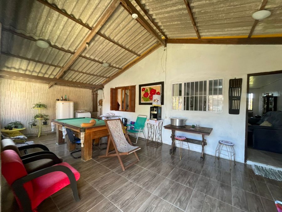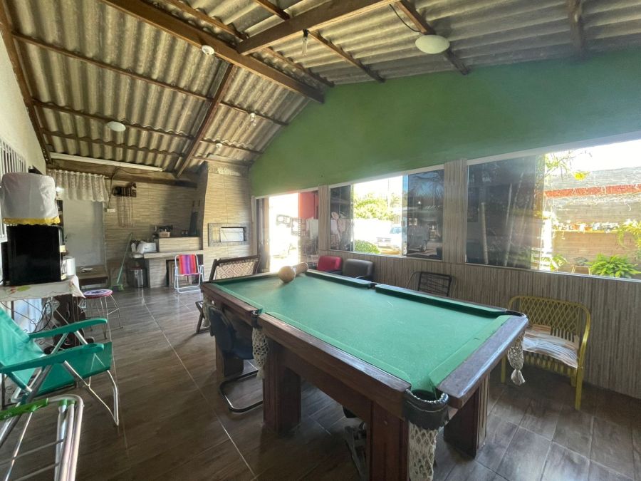 Área de lazer completa com churrasqueira, mesa de sinuca e fogão a lenha