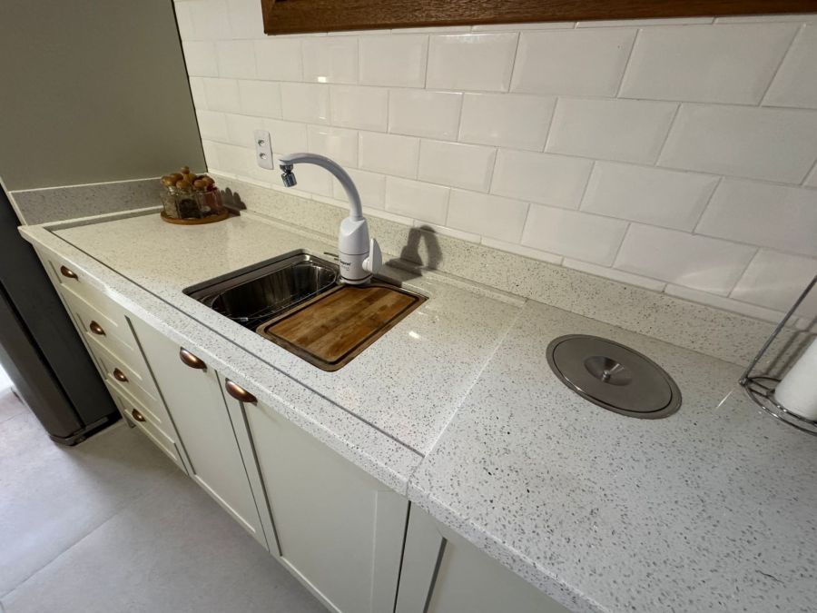 • Área gourmet completa com churrasqueira, fogão campeiro ("fogão de rabo"), pia e bancada em quartzo branco