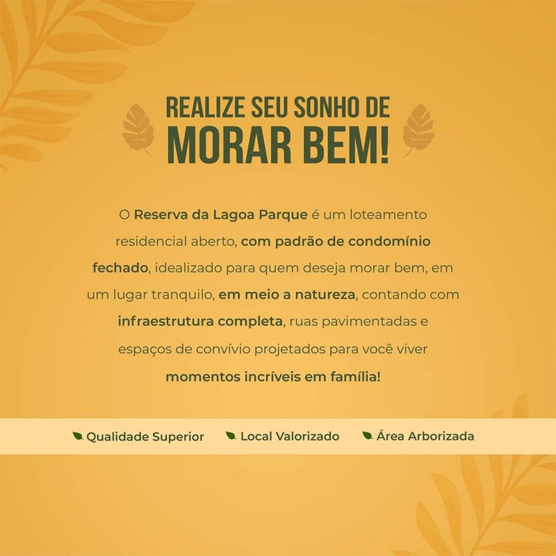 Venha para o Reserva da Lagoa Parque, um loteamento residencial aberto com padrão de condomínio fechado, idealizado para quem quer morar em um lugar com padrão de qualidade superior.