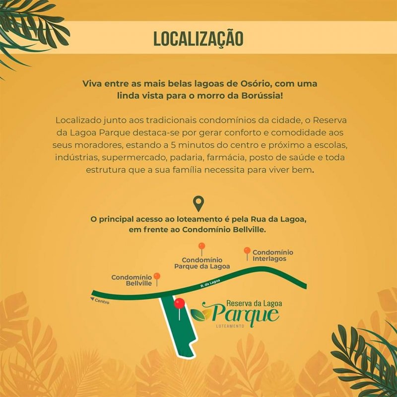 O novo empreendimento está localizado em uma área privilegiada, na Rua da Lagoa, entre os maiores condomínios de Osório e a 5 minutos do centro da cidade!